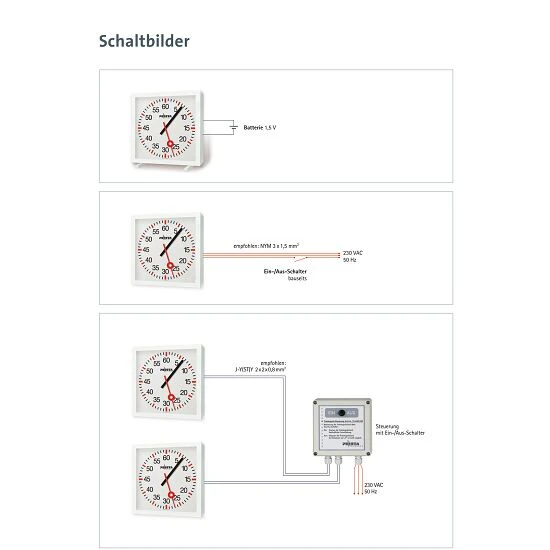 Empfohlen bei Dauerbetrieb und/oder wenn ein fester Montageort gewünscht ist. Nur für Wandaufhängung und Stromversorgung mittels Festanschluss. Lieferung inkl. aushebelsicherer 3-Punkt-Befestigung. Auch als Nebenuhr zur Wandmontage einsetzbar. Impulsgesteuert 24 V zum (Fest-)Anschluss an eine zentrale Steuerung. Empfohlen für zeitsynchronen Parallelbetrieb von 2 Trainingsuhren (feste Montageorte). Lieferung inkl. aushebelsicherer 3-Punkt-Befestigung. Zum Betrieb ist eine Steuerung erforderlich. Lieferung auf Anfrage möglich.