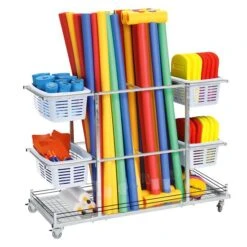 Der Aufbewahrungswagen Comfy III bietet allen Schwimmbädern einen einfachen Transport und die Lagerung von bis zu 60 Poolnudeln. Dank der 4 Kunststoffkörbe wird zusätzlich für Ordnung gesorgt. Neben den Comfy Noodles können weitere Schwimm-Produkte wie Schwimmbretter oder Schwimmflossen gelagert werden. Eine Isilink-Leine dient als Reling im unteren Bereich des Wagens, so dass keine Bälle mehr wegrollen oder aus dem Wagen fallen.