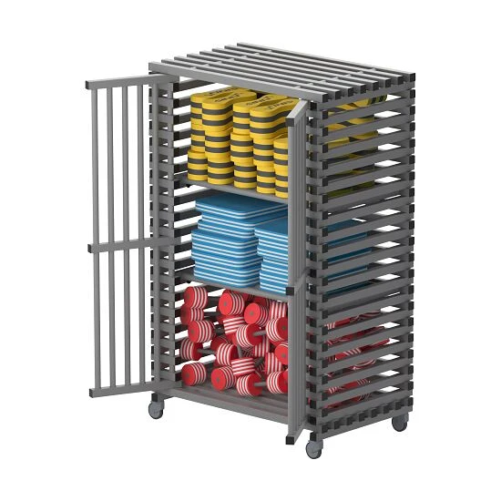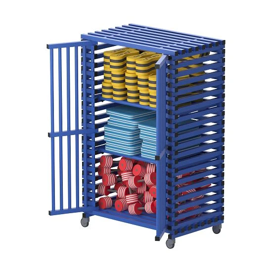 Der Sport-Thieme Regalwagen für Schwimmbad-Equipment by Vendiplas bietet abschließbare Türen, eine stabile Konstruktion mit Zwischenräumen für die bessere Luftzirkulation und schnelles Trocknen. Das Obergestell eignet sich beispielsweise für Schwimmbretter und weitere Schwimmhilfen. Dank der Herstellung aus hygienischem Kunststoff aus Polyvinylchlorid (PVC) hält der Wagen Temperaturen von -40 °C bis +80 °C stand, kommt ohne rostende Metallteile und ist leicht zu reinigen. Auch ist er resistent gegen UV-Licht, Chlor und Wasser.