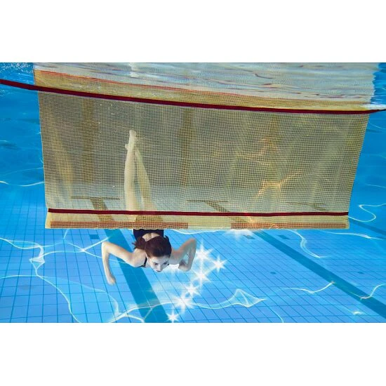 Das Sport-Thieme Tauchhindernis „Training“ ist ein 210 cm breites und 70 cm hohes Kunststoffgitter, welches Sie ganz einfach anbringen: Mittels Clips ist die Höhe einstellbar und Sie können es zwischen 2 Startleinen einhängen oder am Beckenrand befestigen. Dafür sind rechts und links 2 Spannleinen angebracht. Zur Stabilisierung des Sport-Thieme Tauchhindernis „Training“ im Wasser werden an der Unterseite rote Kunststoffstäbe als Ballast eingesetzt. Für den Transport und die Lagerung ist ein neuer Beutel entwickelt worden, der das Trocknen des Materials begünstigt.