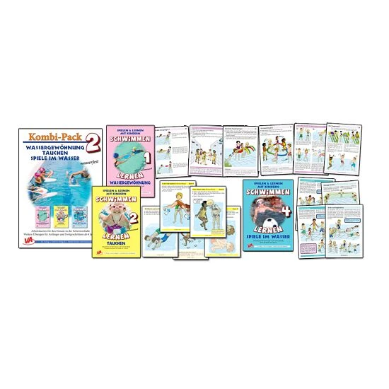 Der Kartensatz „Wassergewöhnung“ besteht aus 48 Seiten (24 beidseitige Karten). Einfache Übungen nehmen Kindern die Angst vom Wasser. Die Kids erlernen das Schwimmen spielerisch – von Duschspielen hin bis zum Springen, Tauchen und ersten Schwimmbewegungen.