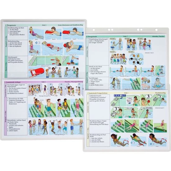 Die Va-verlag Übungskarten „Schwimmen lernen in 12 Stunden“ gliedern sich in verschiedene Trainingsstunden à 45 Minuten. Optimal ist eine Gruppenstärke von 6-10 Kindern. Die Übungsstunden können Sie natürlich auch anders einteilen, wenn Ihnen weniger Zeit zur Verfügung steht. Ausserdem stehen Alternativübungen zur Verfügung – etwa für Kinders mit unterschiedlichen motorischen Fähigkeiten. Wenn die Kids die Trainingseinheiten schnell meistern, können Sie die Alternativen Übungen überspringen. Sie erhalten wertvolle Tipps, um die Kinder zu motivieren und Freude am Schwimmen lernen zu vermitteln. Spaßübungen für zwischendurch lockern den Schwimmunterricht auf.